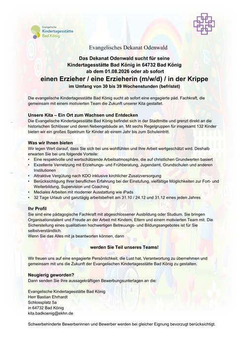 Die Evangelische Kindertagesstätte Bad König befindet sich im Stadtkern von Bad König und seit September 2023 auch mit einer eingruppigen Außenstelle (Naturgruppe) im Friedhofsweg.